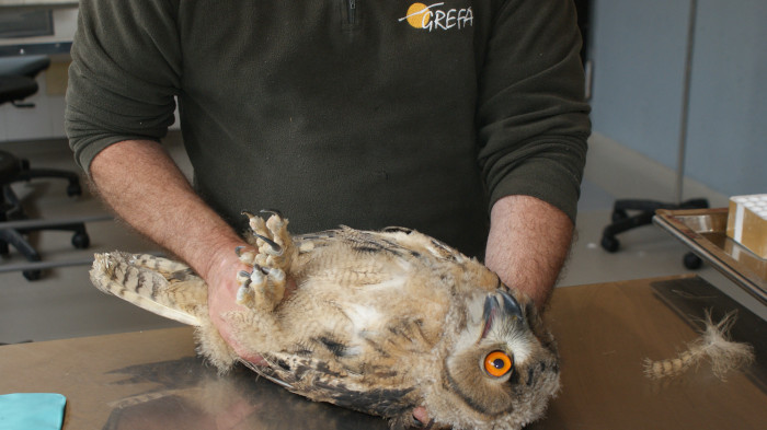 Un búho real irrecuperable durante su revisión veterinaria periódica.