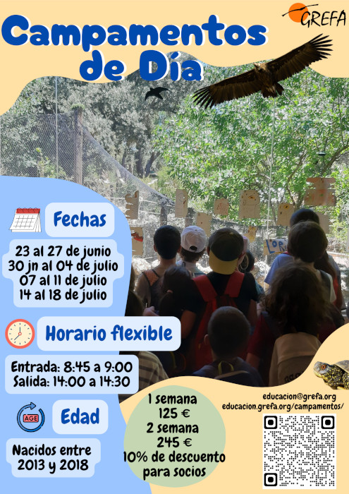 Este año los Campamentos de Verano de GREFA tendrán lugar del 23 al 27 de junio, del 30 de junio al 4 de julio, del 7 al 11 de julio y del 14 al 18 del mismo mes. Las actividades se desarrollarán en horario de 9:00 a 14:00 horas (entrada y salida en horario flexible de 8:45 y 14:30 horas). En cuanto a los días y los precios: 1 semana, 125€; dos semanas, 245€. Hay descuentos del 10% para los socios de GREFA.