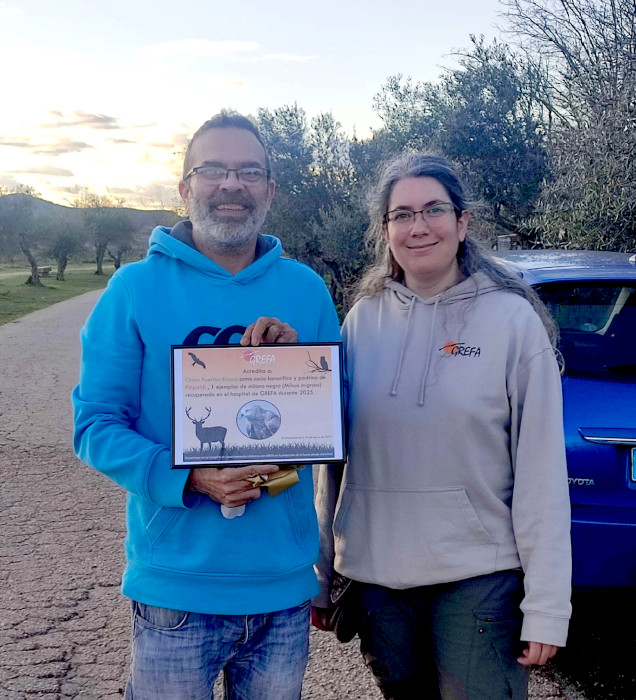 Omar, con el diploma que le acredita como padrino del milano negro “Fitipaldi”, junto a nuestra compañera Carolina Esteban, del Equipo de Rescate de GREFA.