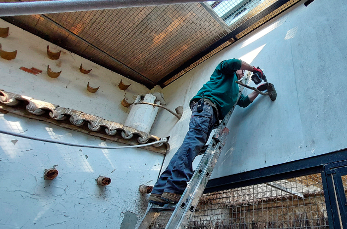 Un operario del Zoo de Córdoba instala un posadero en la instalación remodelada para el cernícalo primilla.