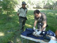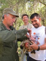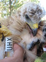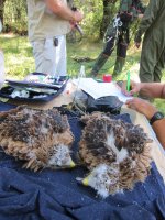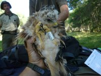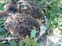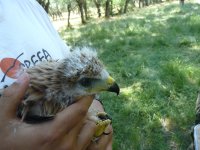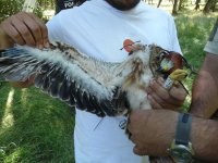 Las visitas periódicas nos mostraron que en Mayo nacieron sus dos pollos…, crecieron sin problema y llegó la hora de marcarlos, a los dos les pusimos Anillas y uno de ellos fue equipado con un transmisor-GPS que nos dará mucha información sobre la biología de la especie y las relaciones Paterno-Filiales. Actualmente, los dos pollos se encuentran volando por la Fresneda Madrileña donde nacieron…