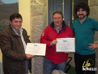 Además, pudimos comprobar la aceptación y colaboración por parte de los principales agentes locales con la recuperación de su población de águila real. Cazadores y gestores de los montes comunales apoyan y facilitan la ejecución del proyecto. Prueba de ello fue la estupenda acogida que dispensaron al LIFE BONELLI en la cena de confraternización con la que nos agasajaron. LIFE BONELLI agradeció esta hospitalidad compartiendo productos de las diferentes regiones (dulces y aceite andaluces, queso y chistorra de Navarra y sobrasada y ensaimada mallorquinas), además de una ‘sonada de xirimia’ –la gaita mallorquina- y de gaita gallega. Por otro lado, se les hizo entrega de sendos diplomas de agradecimiento y reconocimiento por su labor en pro de la recuperación de las rapaces.