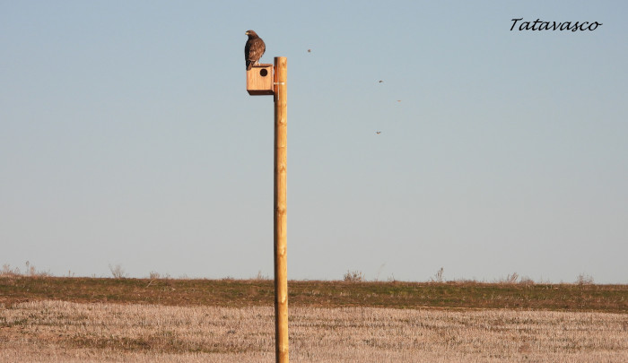 Un busardo ratonero usa como oteadero una caja para mochuelo en un paisaje típicamente estepario. Foto: Tatavasco.