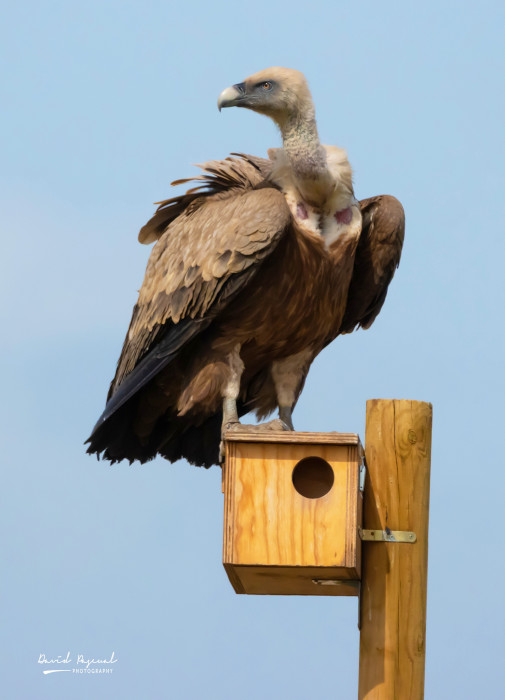 Un buitre leonado descansa encima de un poste con caja-nido de nuestro proyecto de control biológico de topillo campesino. Foto: David Pascual.
