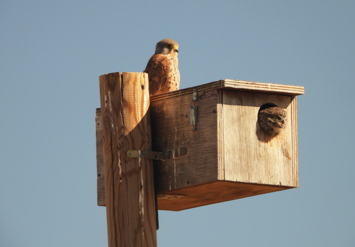 Un cernícalo vulgar y un mochuelo, dos de las especies a las que favorece el proyecto de control biológico de GREFA, coinciden en una misma caja-nido. Foto: Tatavasco)