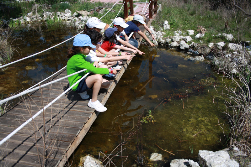 Varios niños observan una charca integrada en las instalaciones de educación ambiental de...