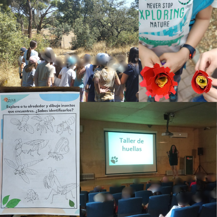 A lo largo del desarrollo del campamento, los niños conocieron las amenazas que afectan a la fauna salvaje -incluyendo los grandes olvidados como son los insectos y anfibios- mediante gymkhanas y cuadernos de campo, donde recogimos datos sobre plumas, huellas, historias de GREFA, etc. Además, durante el campamento de verano se fomentó la creatividad y sostenibilidad con talleres de reciclaje donde se construyeron instrumentos musicales, objetos decorativos y accesorios reutilizando materiales naturales o desechados.