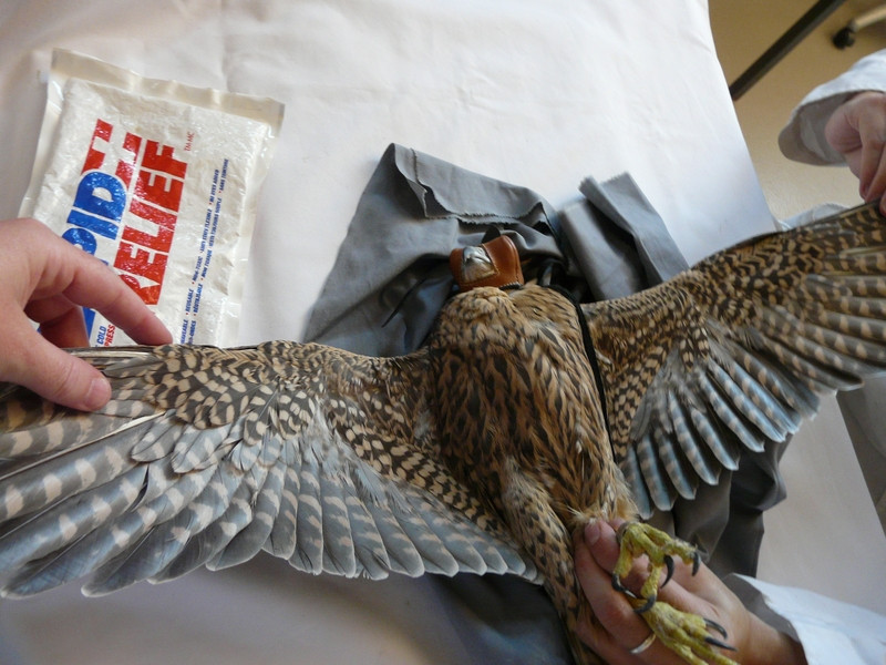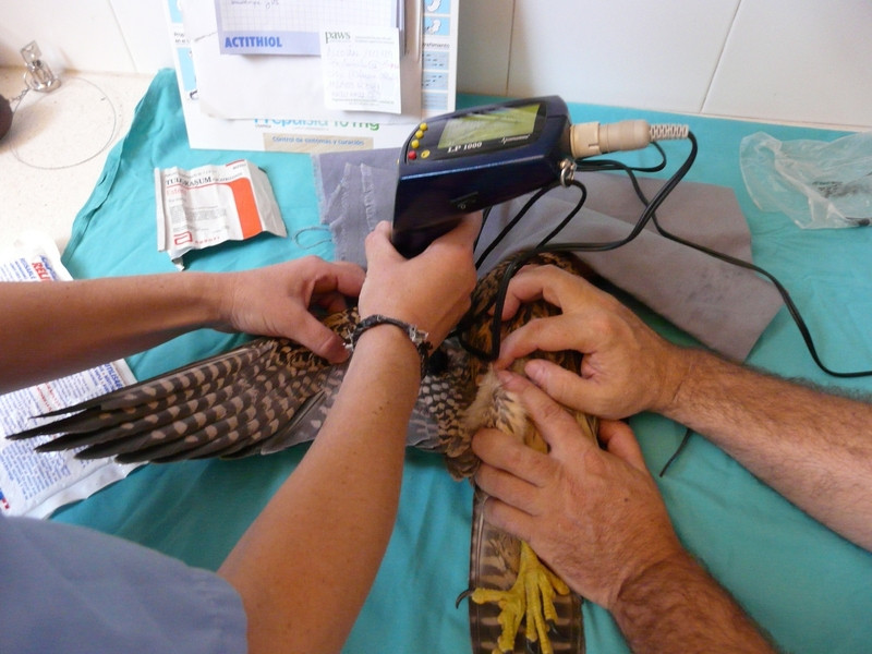 Fue necesario que el equipo de veterinarios del centro inmovilizaran el área fracturada así como varias sesiones de fisioterapia, algunas bajo sedación por el carácter doloroso de la lesión, hasta conseguir que estuviese en condiciones óptimas de pasar a musculación .El manejo de ejemplares de Halcón Peregrino ha de ser extremadamente cuidadoso ya que es una especie altamente estresable.