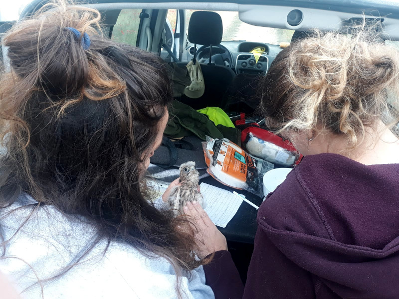 Ana Alonso ayuda a extraer muestras a un pollo de cernícalo vulgar de los nacidos en las cajas nido que GREFA coloca en Castilla y León para el control biológico del topillo.