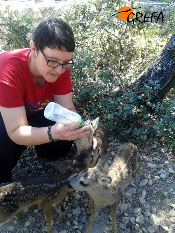Una cuidadora da un biberón de leche a tres crías de corzos en el hospital de fauna de GREFA. Foto: GREFA.GREFA se fundó en 1981 y desde entonces esta ONG ha atendido a casi 50.000 animales en su Hospital de Fauna Salvaje, el más grande y de más actividad de Europa en su especialidad, con una plantilla de 25 personas entre veterinarios, rehabilitadores, fisioterapeutas especializados en fauna, biólogos y naturalistas.