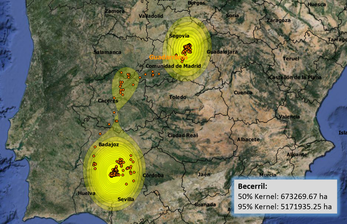 Como ya os contamos recientemente, uno de los pollos marcados en 2014, Becerril, comenzó su etapa dispersiva en otoño de ese mismo año, asentándose en la provincia de Badajoz para más tarde continuar hacia el sur y llegar a la provincia de Córdoba, donde finalmente cayó víctima del veneno, hecho que pudimos detectar gracias a las localizaciones aportadas por el emisor GPS.