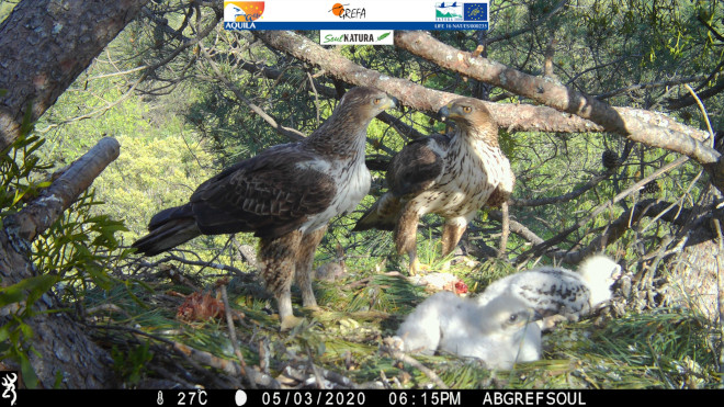 Imagen de fototrampeo de la pareja de águila de Bonelli "Haza" y el macho "Bélmez", junto con sus pollos del año 2020, uno de los cuales es "Montazo". Foto: GREFA y Soul Natura.