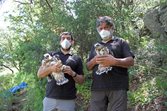 Los pollos de águila de Bonelli nacidos en 2020 de la pareja formada por "Haza" y "Bélmez", cuando fueron capturados momentáneamente para colocarles un emisor GPS. El que aparece a la derecha es "Montazo". Foto: GREFA.
