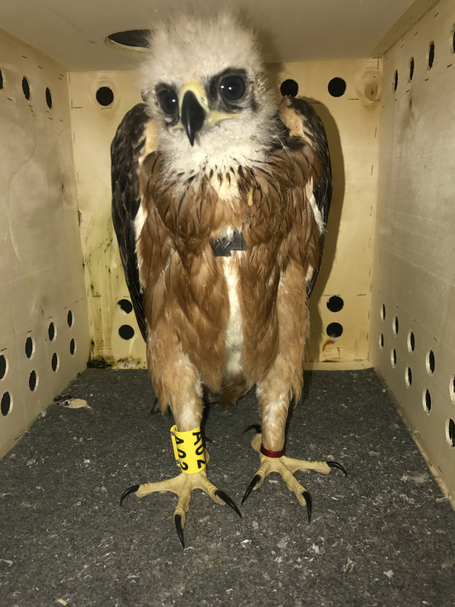 El pollo de águila de Bonelli nacido en el centro de GREFA, a la llegada a la zona de reintroducción de Cerdeña |