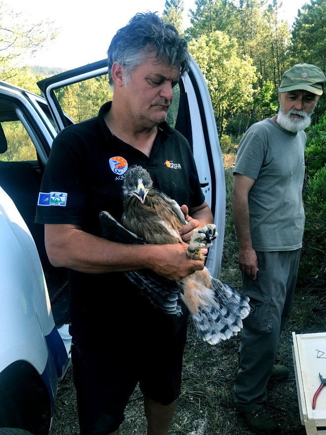 En un primer traslado, el 28 de junio se llevaron a este espacio protegido cuatro ejemplares (3 hembras y 1 macho), nacidos en cautividad en el centro de cría de la especie que gestiona Christian Pacteau (UFCS-LPO) en Vendée (Francia). Antes de que viajasen a Italia, estas aves estuvieron unos días en el centro de GREFA, para su sexado, revisión veterinaria, anillamiento y marcaje con emisor GPS/GSM. Casi todo el tiempo permanecieron junto a una de las parejas reproductora de la especie mantenidas en este centro. En el segundo traslado, una única águila de Bonelli nacida en las propias instalaciones de GREFA partió hacia Cerdeña el pasado 23 de julio. En ambas expediciones, los pollos viajaron en un vehículo de AQUILA a-LIFE desde Majadahonda a Barcelona y de ahí en ferry hasta la localidad sarda de Porto Torres. Con el primer traslado se hizo coincidir una presentación pública del proyecto en Bitti, sede del Parque Regional de Tepilora.