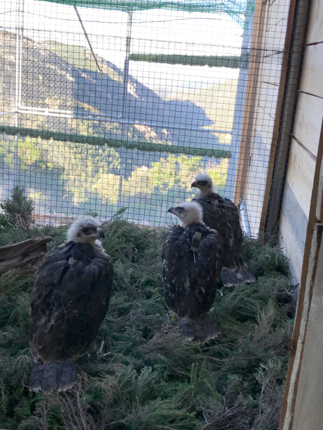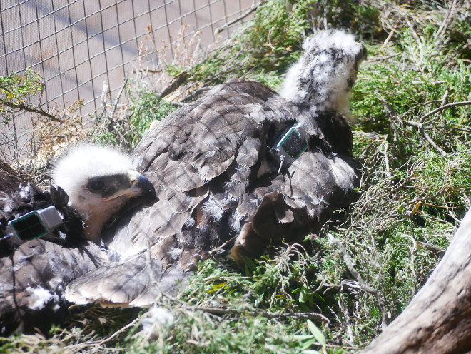 Dos de los pollos de águila de Bonelli, con sus emisores visibles, en la jaula-hacking construida en el Parque Regional de Tepilora (Cerdeña). |