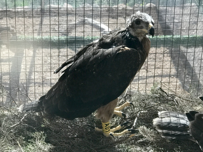 Uno de los pollos de águila de Bonelli, en la jaula-hacking construida en el Parque Regional de Tepilora (Cerdeña). |