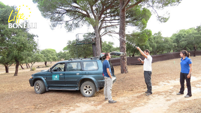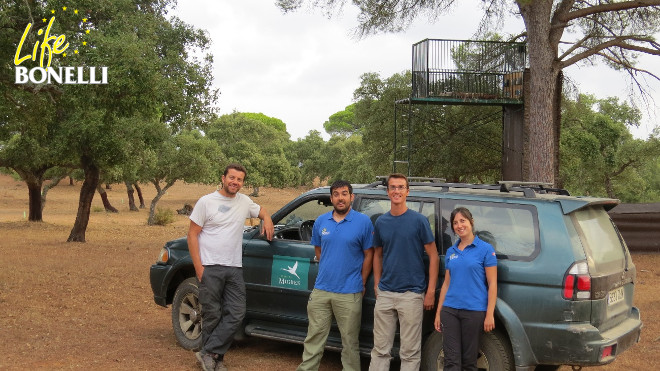 Tres jóvenes águilas imperiales alimentándose.A primeros de Septiembre un equipo del Life Bonelli ha visitado el proyecto de Reforzamiento de Águila Imperial en Cádiz dependiente de la Junta de Andalucía y tutelado por la Fundación Migres y la Estación Biológica de Doñana. Esta visita se ha realizado con el objetivo de conocer proyectos similares al Life Bonelli y poder enriquecernos con su experiencia (Networking).