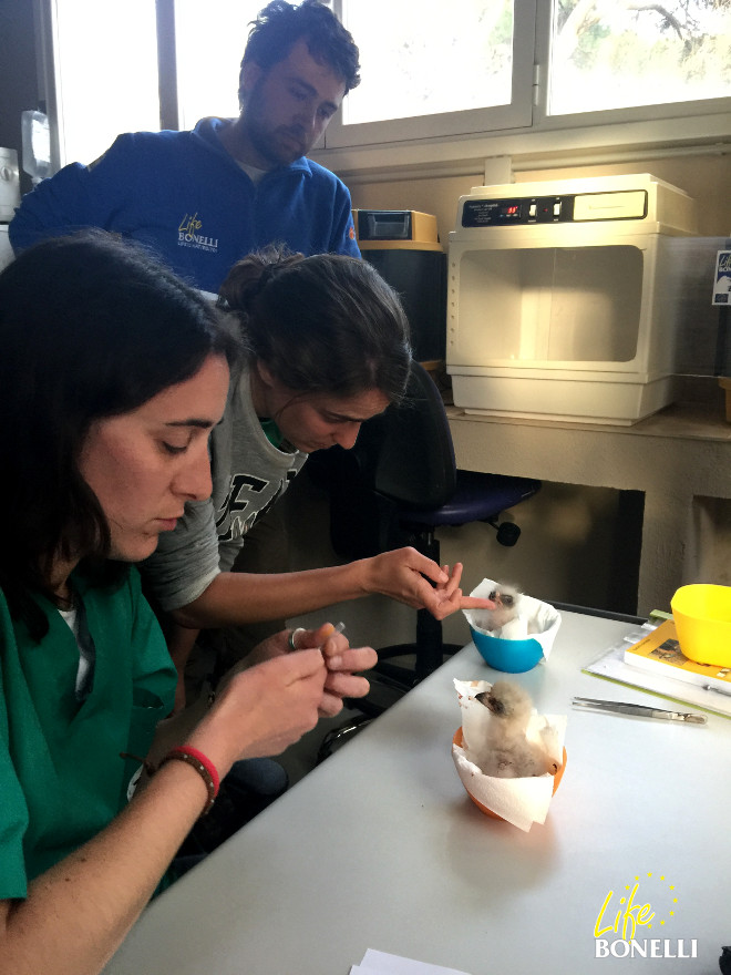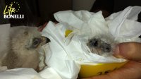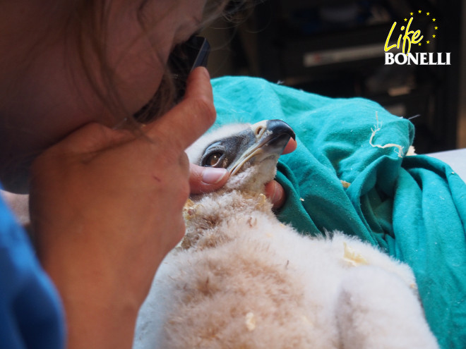 Revisión de los pollos de águila de Bonelli, a los pocos días de nacer, por el personal veterinario de GREFA. Nuestro colaborador Jean-Claude Mourgues, a cargo del centro de cría situado en el departamento de Ardèche (Francia) ha conseguido que salgan adelante dos ejemplares, por primera vez durante el desarrollo del proyecto. Se llaman Albali y Oteo y nacieron el 27 de marzo y el 24 de abril, respectivamente. Albali, procedente de la primera puesta de la pareja Montilla-Moriles, fue liberado en la Comunidad de Madrid. Este ejemplar presentaba, sin embargo, una anomalía en el desarrollo de sus alas, que finalmente impidió que se desenvolviera adecuadamente en sus primeros vuelos. Actualmente se encuentra en el Hospital de Fauna Salvaje de GREFA, donde se valorará su reintroducción más adelante. Oteo, procedente de la segunda puesta de la misma pareja, fue liberado con éxito en Álava.