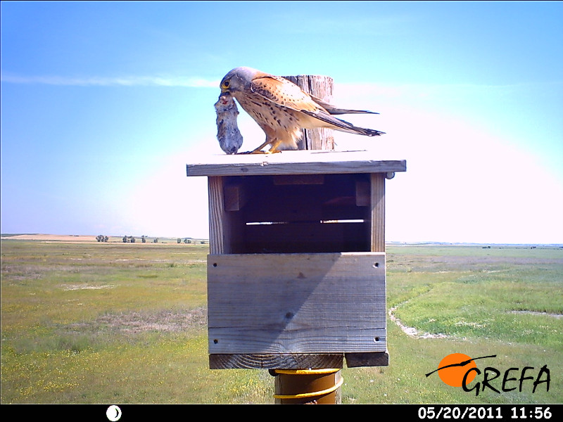 Un macho de cernícalo vulgar con un topillo recién cazado sobre una de las cajas nidos del proyecto de control biológico.GREFA ha firmado un convenio de colaboración con la Diputación de Valladolid y el Instituto Tecnológico Agrario de Castilla y León (ITACYL) para implantar el control biológico del topillo campesino en una comarca de la provincia de Valladolid. Este acuerdo se enmarca dentro de un ambicioso proyecto que el ITACYL y GREFA pretenden llevar a cabo en el territorio de Castilla y León afectado por la plaga de este roedor.