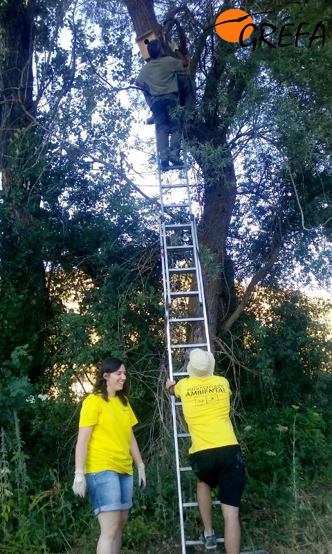 Colocando una caja nido de cárabo en una chopera de Villafruela (Burgos). |