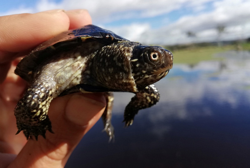 Primer plano de uno de los galápagos europeos juveniles liberados el pasado 4 de noviembre.El pasado 4 de noviembre realizamos una nueva liberación de ejemplares juveniles de galápago europeo criados en cautividad, la última prevista para este año. Estos juveniles se suman a los de sueltas anteriores, lo que da lugar a un total de más de cincuenta ejemplares liberados en 2019 en su hábitat natural en la Comunidad de Madrid, fruto del intenso trabajo que GREFA lleva a cabo con esta especie amenazada, en colaboración con la Fundación Banco Santander.