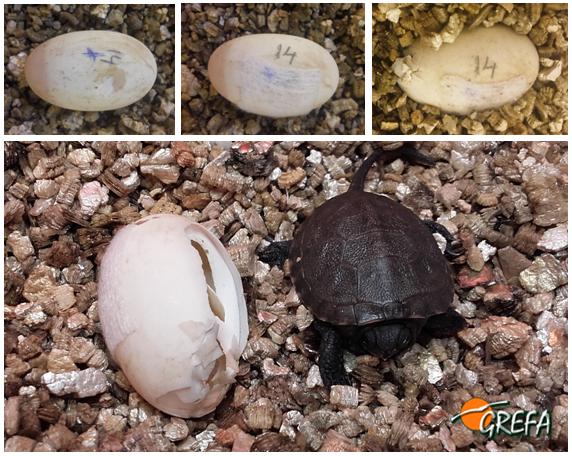 Composición fotográfica que refleja la evolución de uno de los huevos de galápago reparados en GREFA. De izquierda a derecha, huevo con lesión, huevo reparado, neonato picando el huevo y, en la foto grande, neonato cuando ya está fuera.Tal y como os anunciábamos hace unas semanas [https://goo.gl/86rnZZ], durante el pasado mes de septiembre han eclosionado los huevos de galápago europeo que se estaban incubando artificialmente en nuestras instalaciones, en el marco del proyecto de recuperación que GREFA lleva a cabo con esta especie. El resultado no podría haber sido mejor: ¡66 crías nacidas, con una tasa de eclosión superior al 94%!