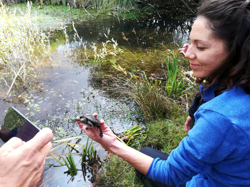 Marta Fernández Allende, de GREFA, libera uno de los doce galápagos europeos introducidos en el Parque Regional de la Cuenca Alta del Manzanares (Madrid). Foto: Comunidad de Madrid.