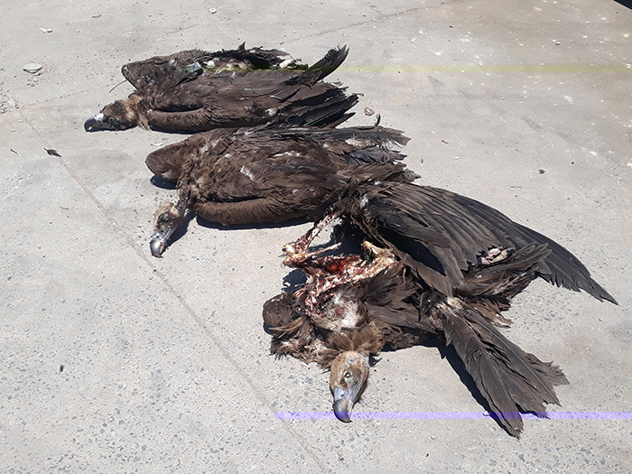 Los tres cadáveres de buitres negros localizados en el CTR Ávila-Norte en junio de 2023.