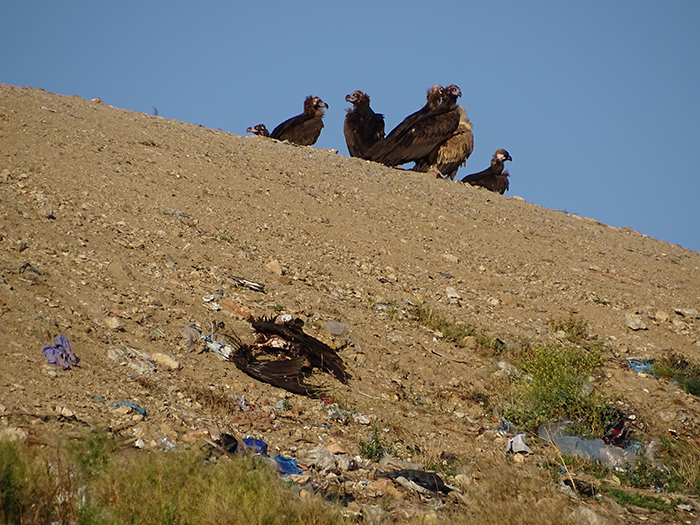 Uno de los cadáveres de buitre negro sobre el talud del vaso de vertidos del CRT Ávila-Norte y, tras él, varios buitres negros y leonados posados.