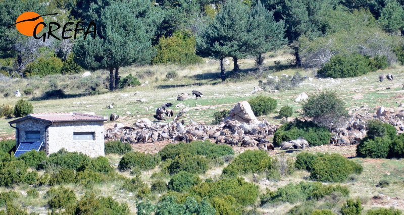 Buitres negros posados entre los leonados después del desayuno en el PAEA finales de agosto, integrantes del Departamento de Cría en Cautividad de GREFA nos desplazamos a la Reserva Nacional de Caza de Boumort en el Prepirineo de Lleida. Nuestra intención era comprobar cómo se desarrollaba la estancia en el hacking de los dos únicos pollos de buitre negro nacidos en cautividad este año 2015 en España. Uno procedía de nuestras instalaciones de cría en GREFA y el otro del centro de “Los Hornos” (Sierra de Fuentes, Cáceres). Ambos habían sido trasladados a Boumort un par de semanas antes e instalados juntos en el nido artificial acondicionado para la ocasión en la zona de reintroducción donde se ha creado la primera colonia pirenaica de la especie tras más de un siglo de ausencia. Allí terminarían su desarrollo y darían el salto para iniciar su primer vuelo (algo que ha ocurrido hace muy pocos días) y así unirse a sus congéneres de la colonia.